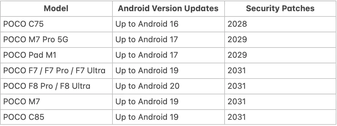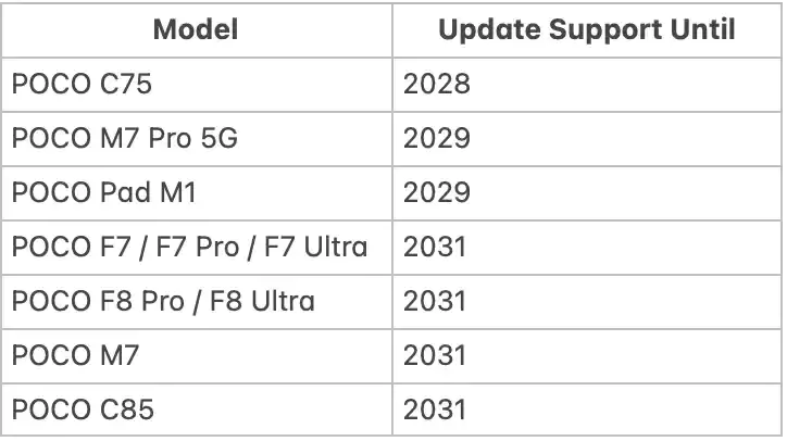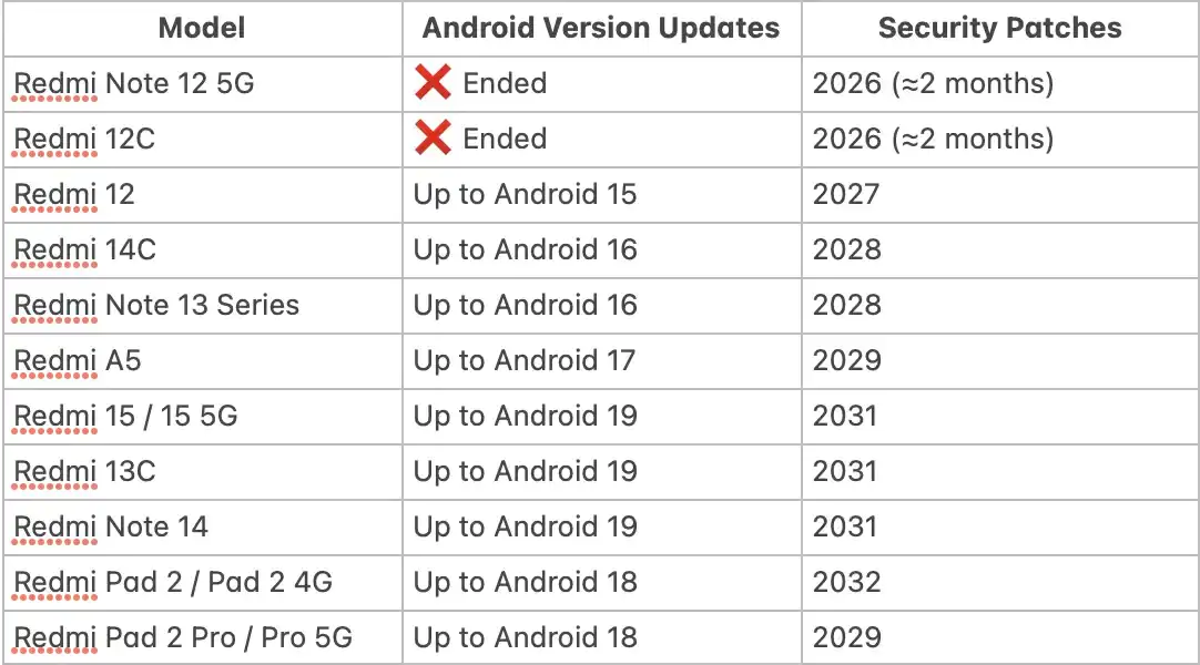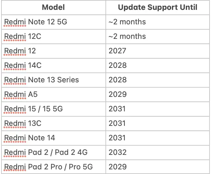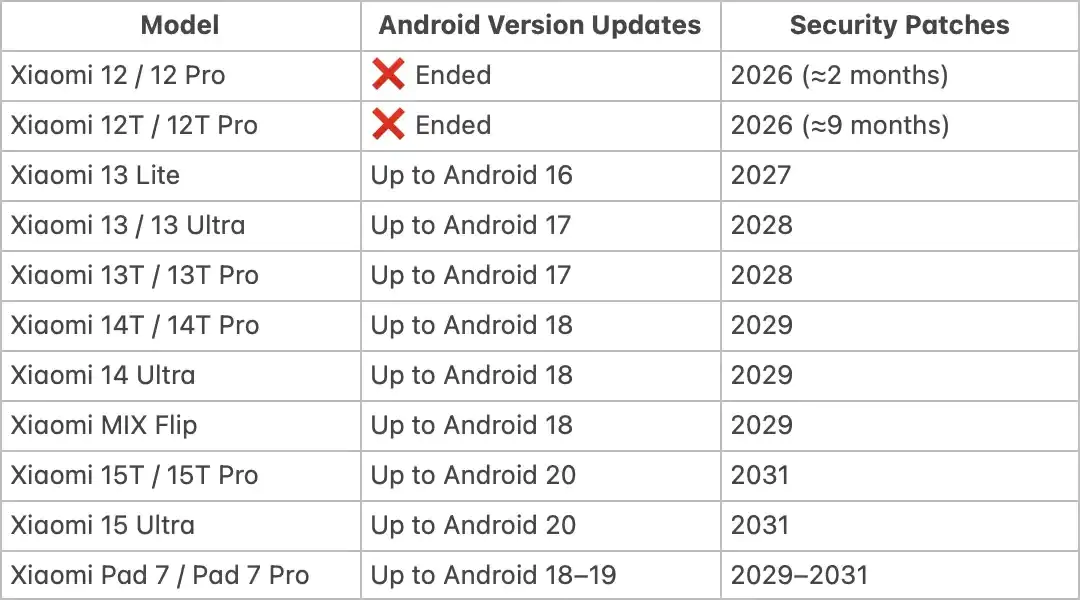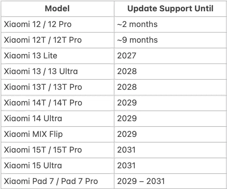 Точные даты окончания поддержки для каждой модели публикуются на официальной странице Xiaomi, посвящённой политике обновлений. Полный список устройств, охваченных новой политикой, доступен в материалах компании.
